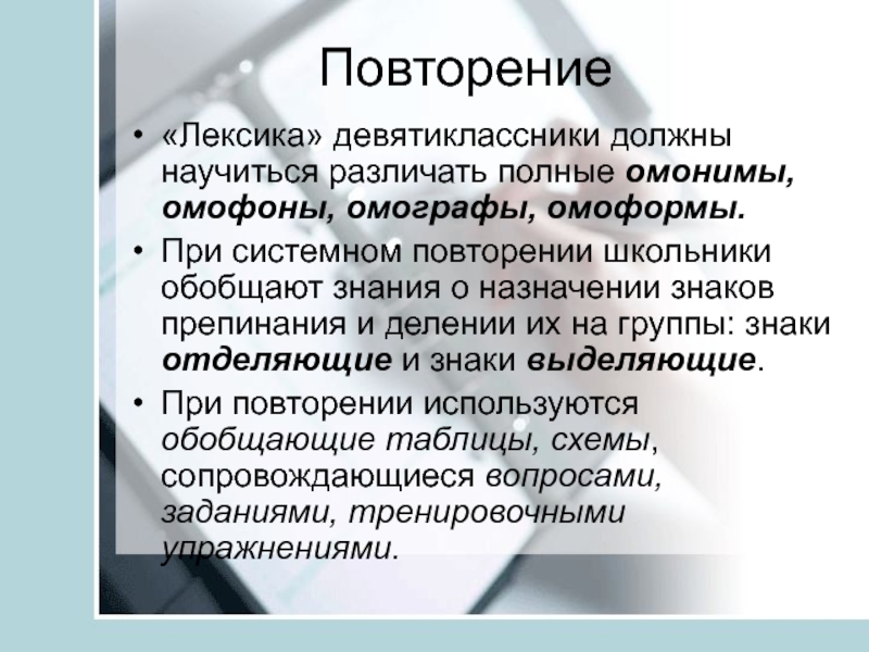 «Лексика» девятиклассники должны научиться различать полные омонимы, омофоны, омографы, омоформы.