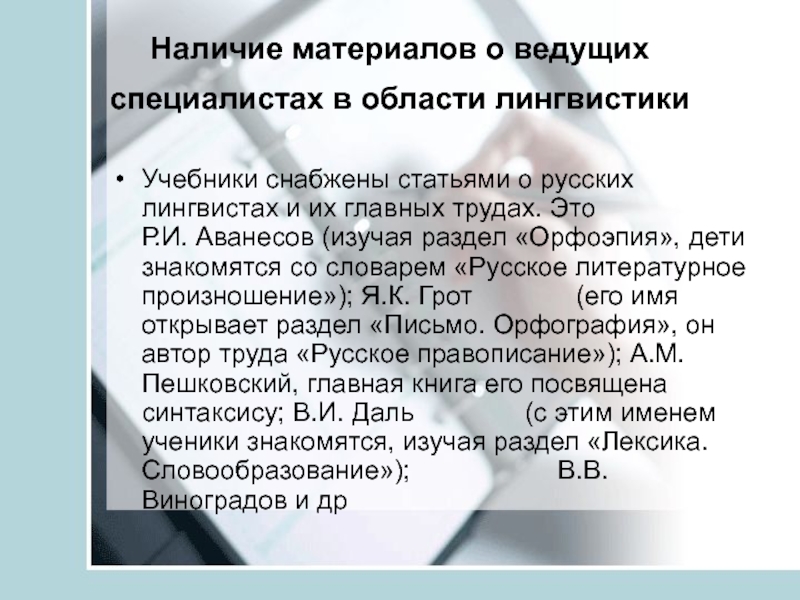 Слайд 10Наличие материалов о ведущих специалистах в области лингвистики