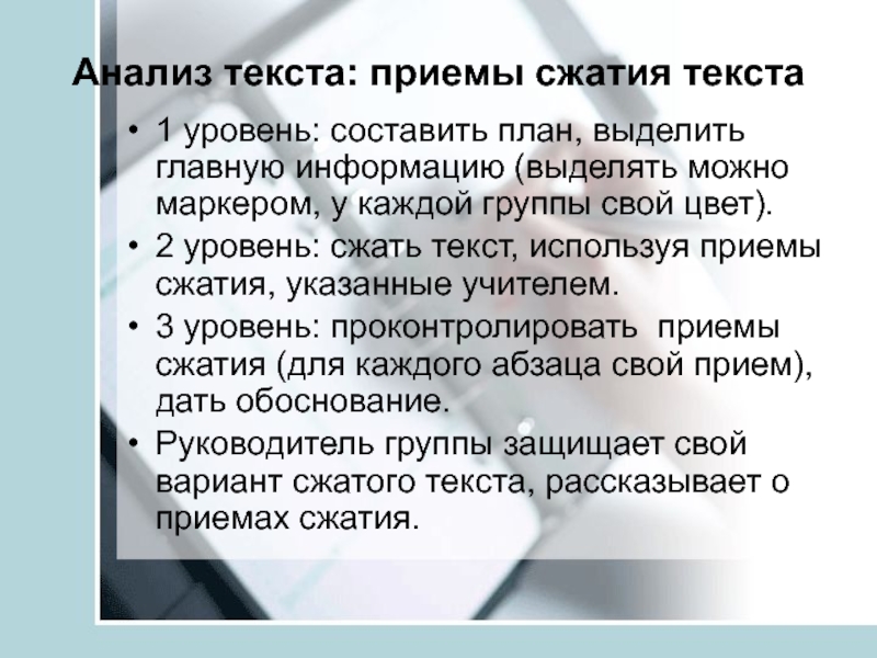 3 уровень: проконтролировать приемы сжатия (для каждого абзаца свой прием), дать обоснование.