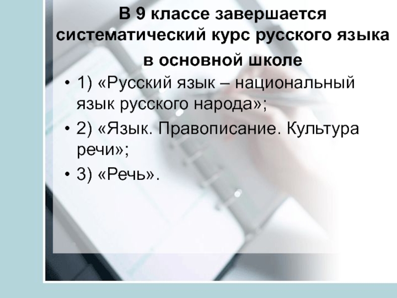 Слайд 6В 9 классе завершается систематический курс русского языка в основной школе