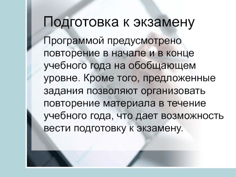 конце учебного года на обобщающем уровне. Кроме того, предложенные задания позволяют организовать повторение материала в течение учебного года, что дает возможность вести подготовку к экзамену.