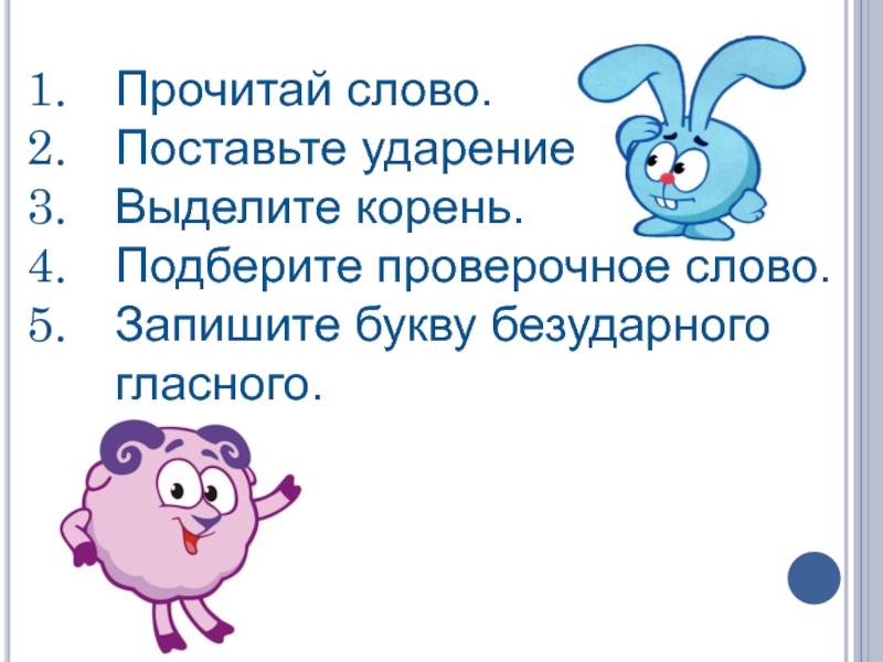 Прочитай слово.Поставьте ударение.Выделите корень.Подберите проверочное слово.Запишите букву безударного гласного.