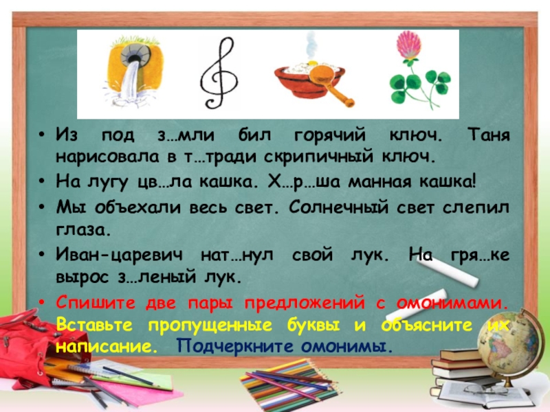Из под з…мли бил горячий ключ. Таня нарисовала в т…тради скрипичный ключ.На лугу цв…ла кашка. Х…р…ша манная