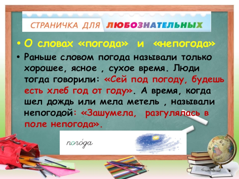 О словах «погода» и «непогода»Раньше словом погода называли только хорошее, ясное , сухое время. Люди тогда говорили: