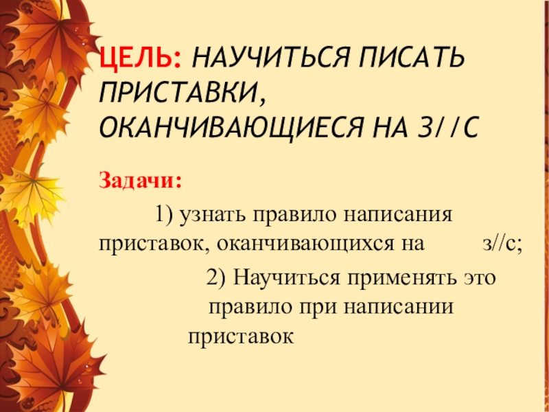 Слайд 8Цель: научиться писать приставки, оканчивающиеся на з//с