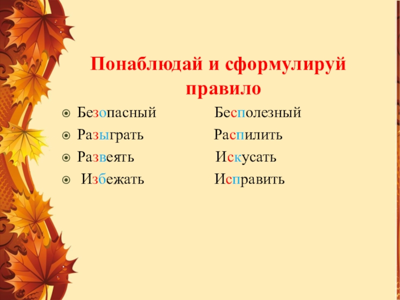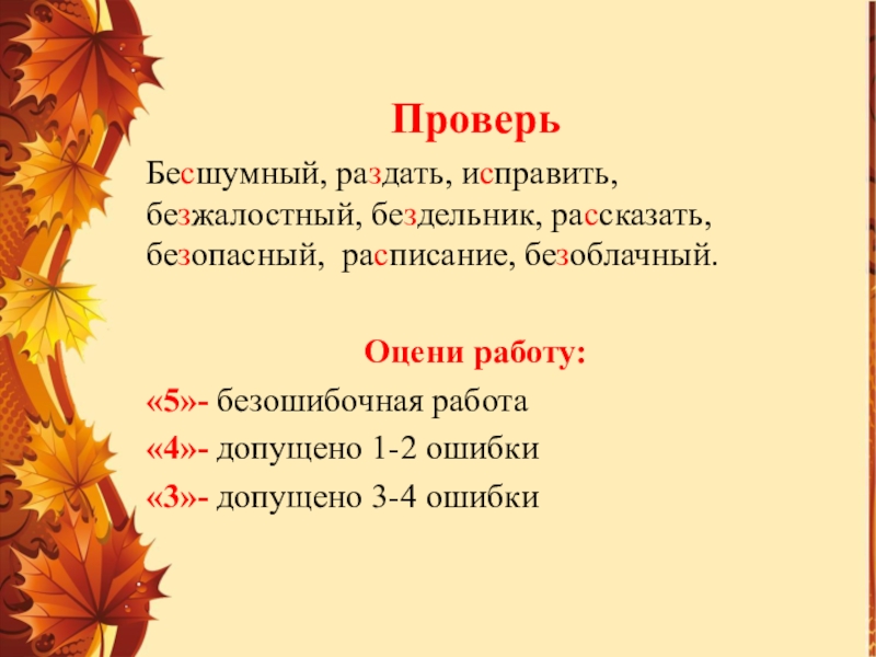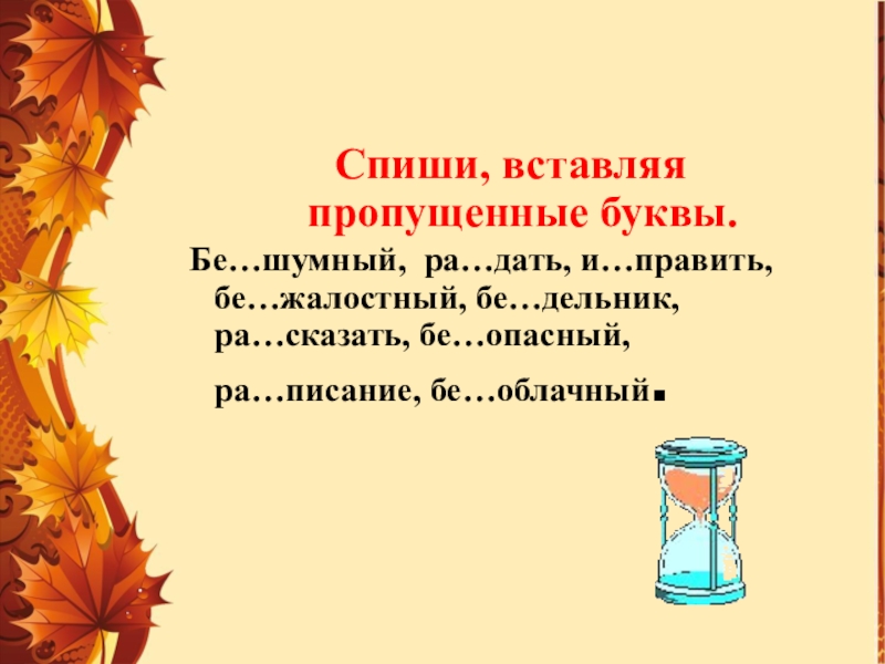 Бесшумный, раздать, исправить, безжалостный, бездельник, рассказать, безопасный, расписание, безоблачный.