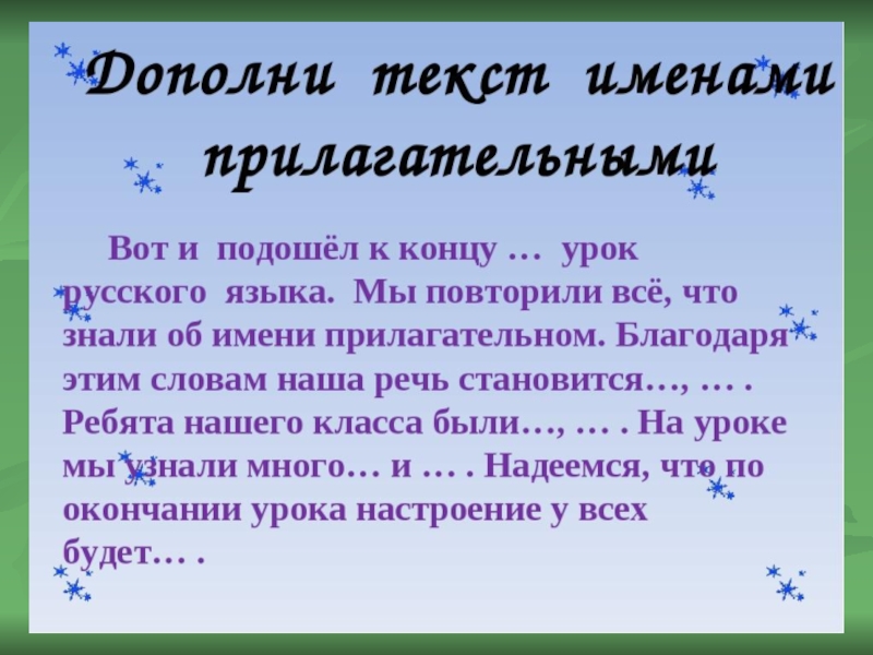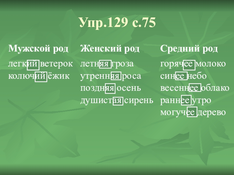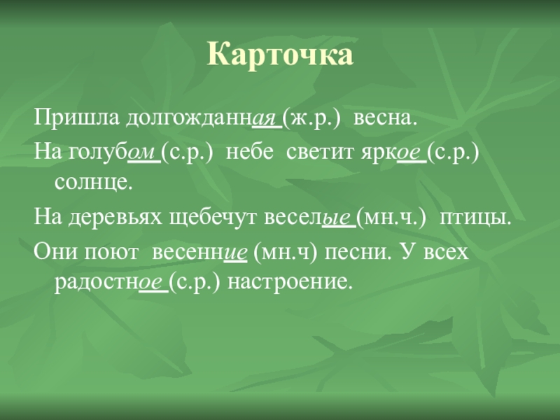 КарточкаПришла долгожданная (ж.р.) весна. На голубом (с.р.) небе светит яркое (с.р.) солнце.На деревьях щебечут веселые (мн.ч.) птицы.Они