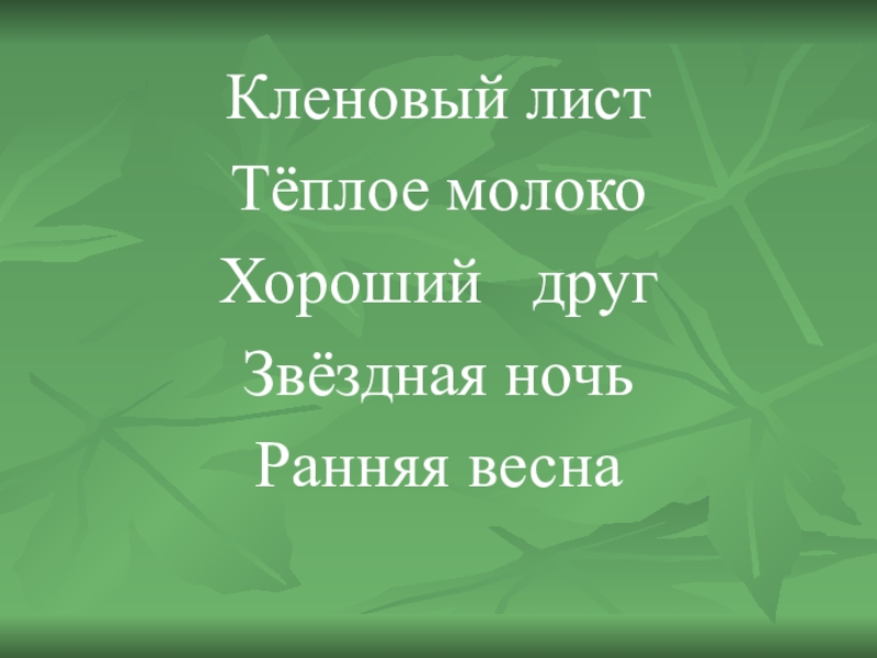 Кленовый листТёплое молокоХороший  другЗвёздная ночьРанняя весна