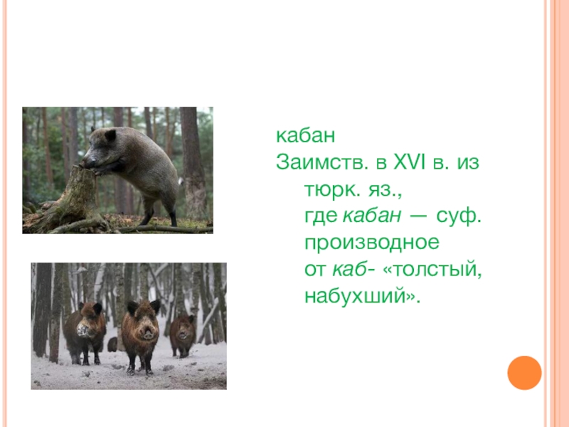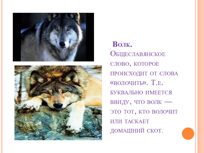 Слайд 3 Волк. Общеславянское слово, которое происходит от слова «волочить». Т.е. буквально имеется