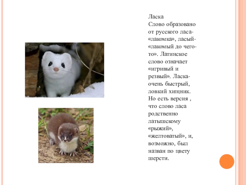 слово означает «игривый и резвый». Ласка- очень быстрый, ловкий хищник. Но есть версия , что слово ласа родственно латышскому «рыжий», «желтоватый», и, возможно, был назван по цвету шерсти.
