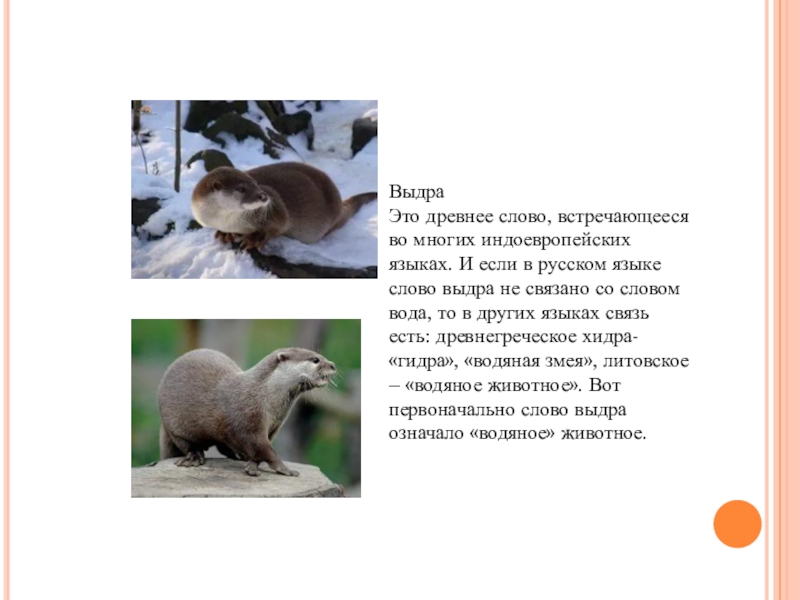русском языке слово выдра не связано со словом вода, то в других языках связь есть: древнегреческое хидра- «гидра», «водяная змея», литовское – «водяное животное». Вот первоначально слово выдра означало «водяное» животное.