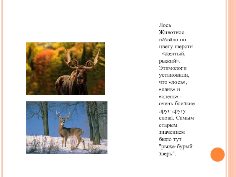 Животное названо по цвету шерсти –«желтый, рыжий». Этимологи установили, что «лось»,
