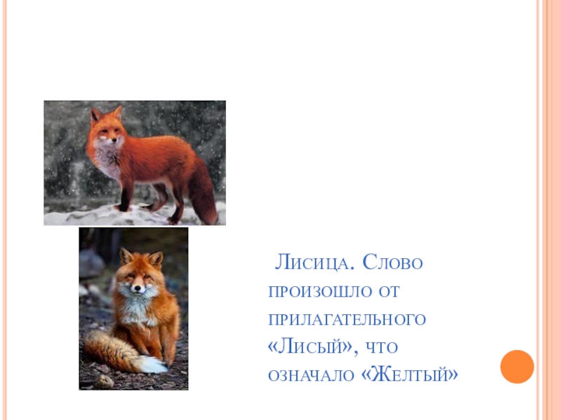Слайд 5 Лисица. Слово произошло от прилагательного «Лисый», что означало «Желтый»