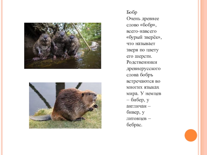 цвету его шерсти. Родственники древнерусского слова бобръ встречаются во многих языках мира. У немцев – бибер, у англичан – бивер, у литовцев – бебрас.