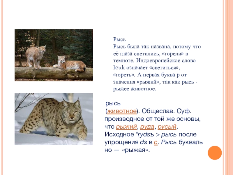 Рысь была так названа, потому что её глаза светились, «горели» в темноте. Индоевропейское слово leuk означает «светиться», «гореть». А первая буква р от значения «рыжий», так как рысь - рыжее животное.