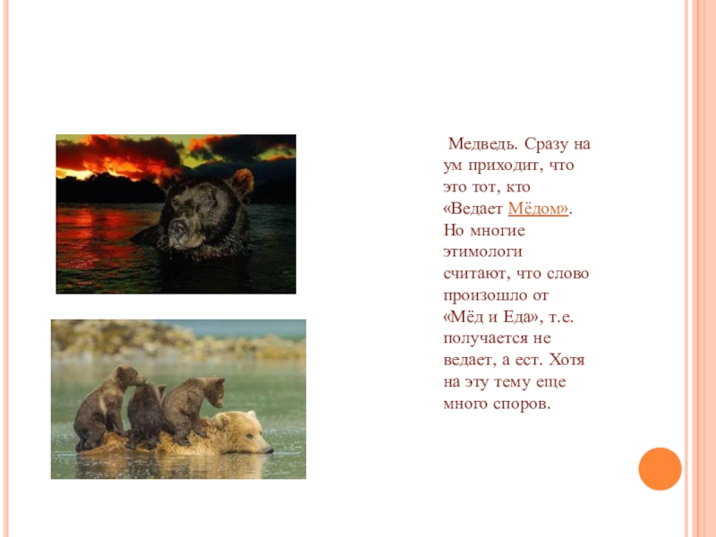 Слайд 6 Медведь. Сразу на ум приходит, что это тот, кто «Ведает Мёдом». Но