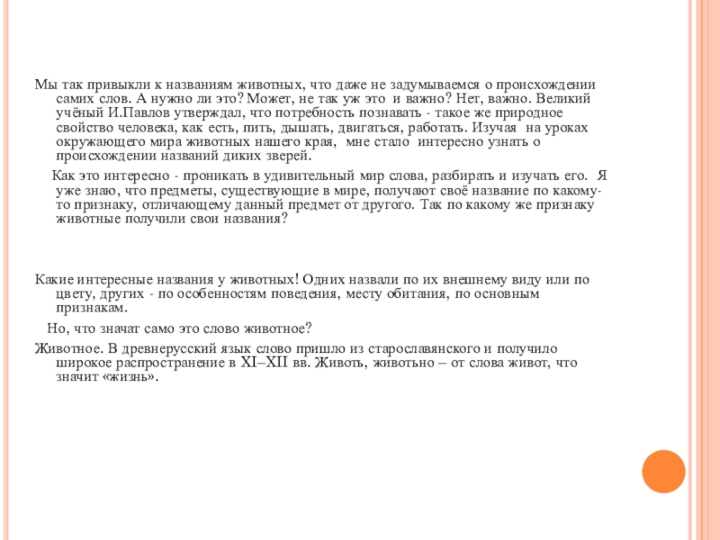 происхождении самих слов. А нужно ли это? Может, не так уж это и важно? Нет, важно. Великий учёный И.Павлов утверждал, что потребность познавать - такое же природное свойство человека, как есть, пить, дышать, двигаться, работать. Изучая на уроках окружающего мира животных нашего края, мне стало интересно узнать о происхождении названий диких зверей.