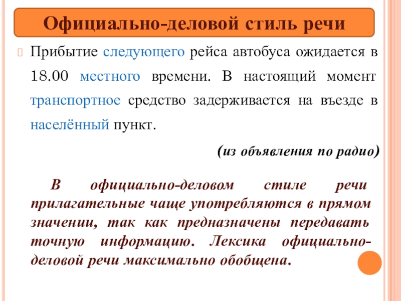 В официально-деловом стиле речи прилагательные чаще употребляются в прямом значении, так как предназначены передавать точную информацию. Лексика официально-деловой речи максимально обобщена.