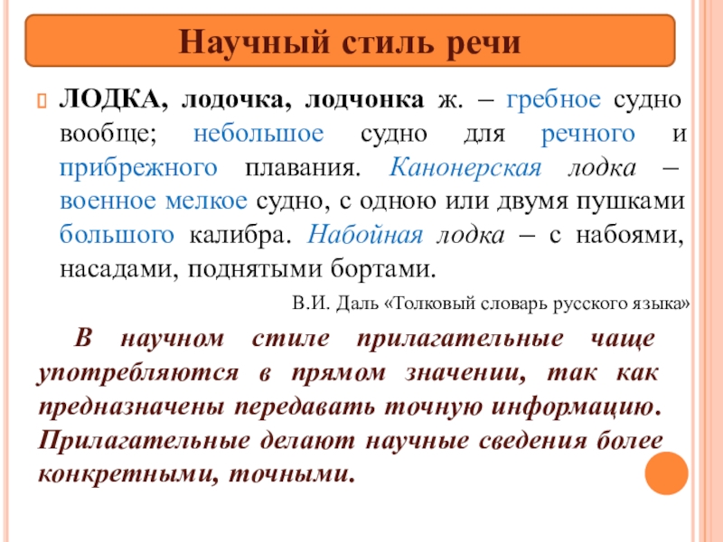 В научном стиле прилагательные чаще употребляются в прямом значении, так как предназначены передавать точную информацию.