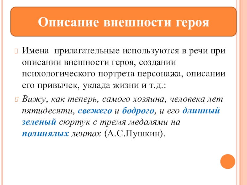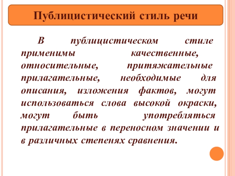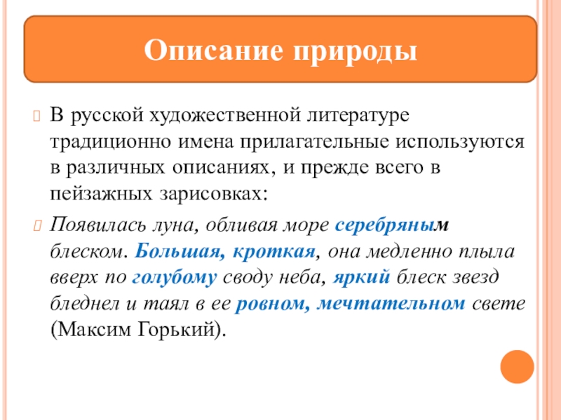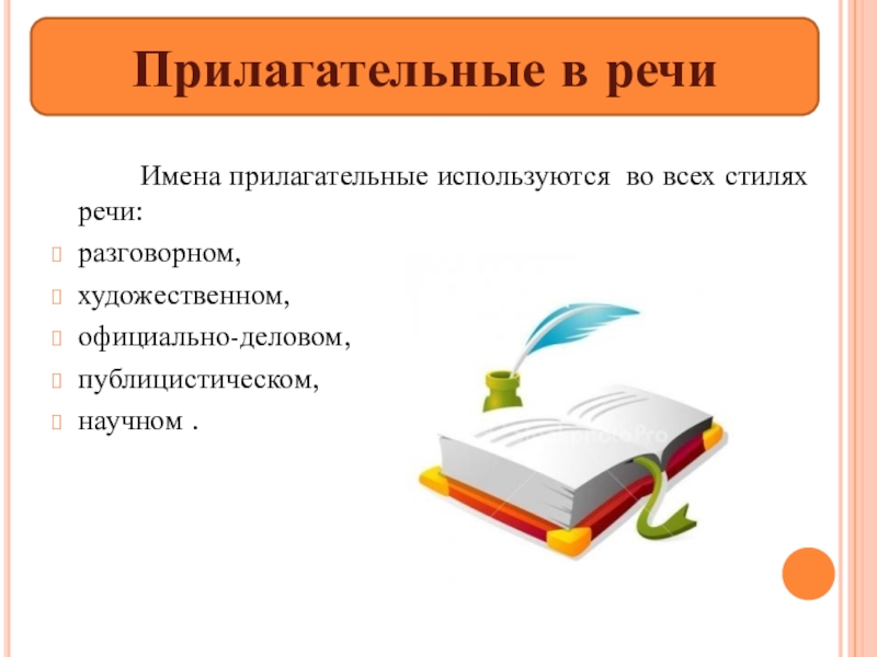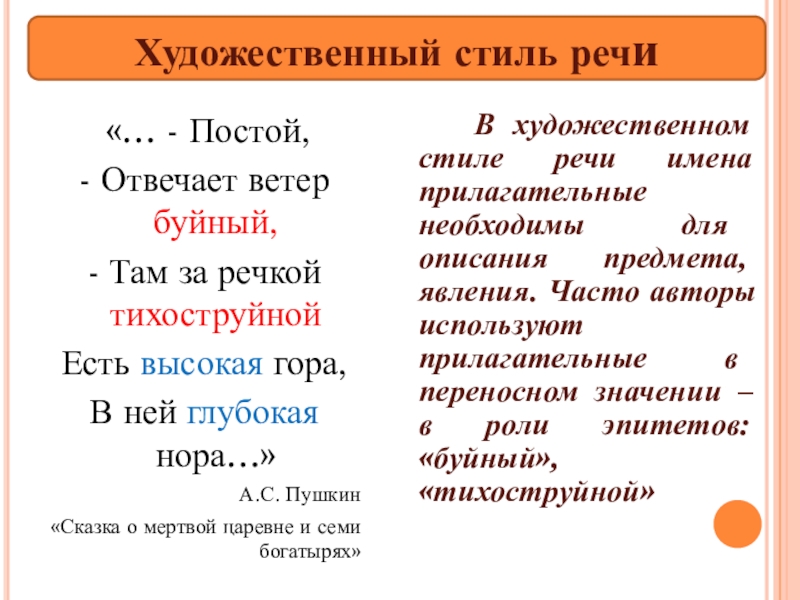 В художественном стиле речи имена прилагательные необходимы для описания предмета, явления. Часто авторы используют прилагательные в переносном значении – в роли эпитетов: «буйный», «тихоструйной»