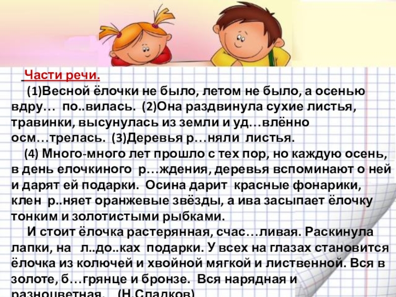 (4) Много-много лет прошло с тех пор, но каждую осень, в день елочкиного р…ждения, деревья вспоминают о ней и дарят ей подарки. Осина дарит красные фонарики, клен р..няет оранжевые звёзды, а ива засыпает ёлочку тонким и золотистыми рыбками.