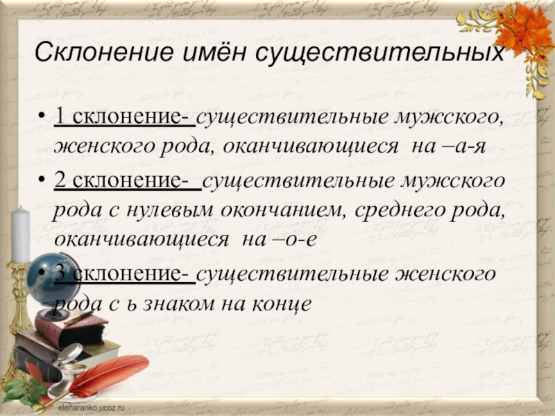 1 склонение- существительные мужского, женского рода, оканчивающиеся на –а-я
