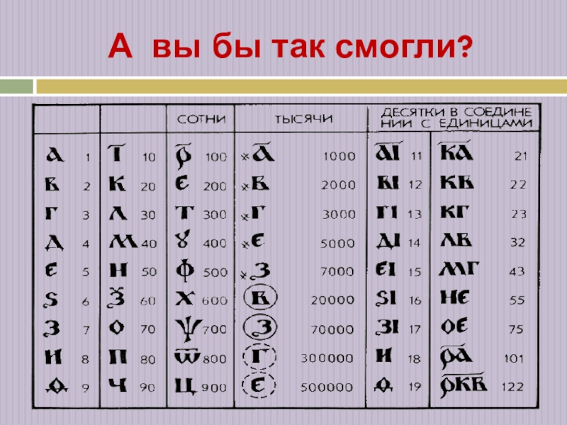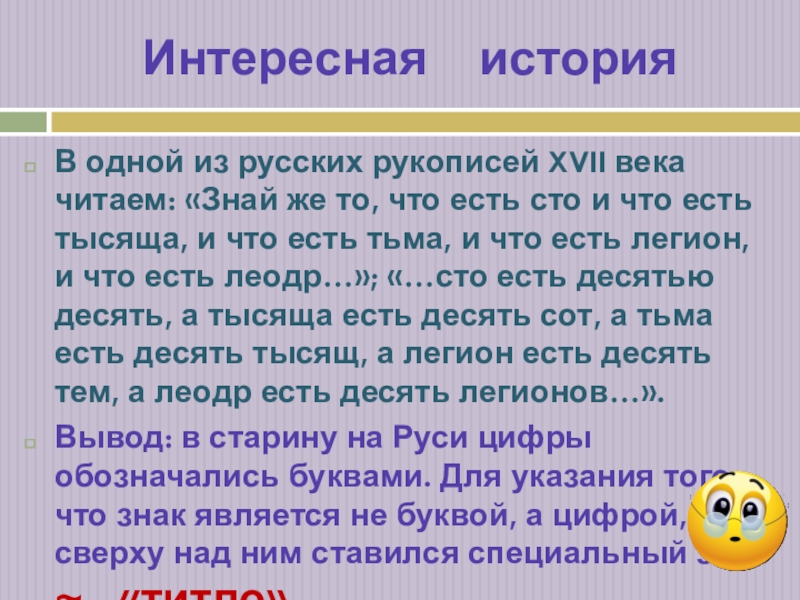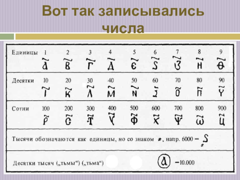 Вывод: в старину на Руси цифры обозначались буквами. Для указания того, что знак является не буквой, а цифрой, сверху над ним ставился специальный знак ~ , «титло».