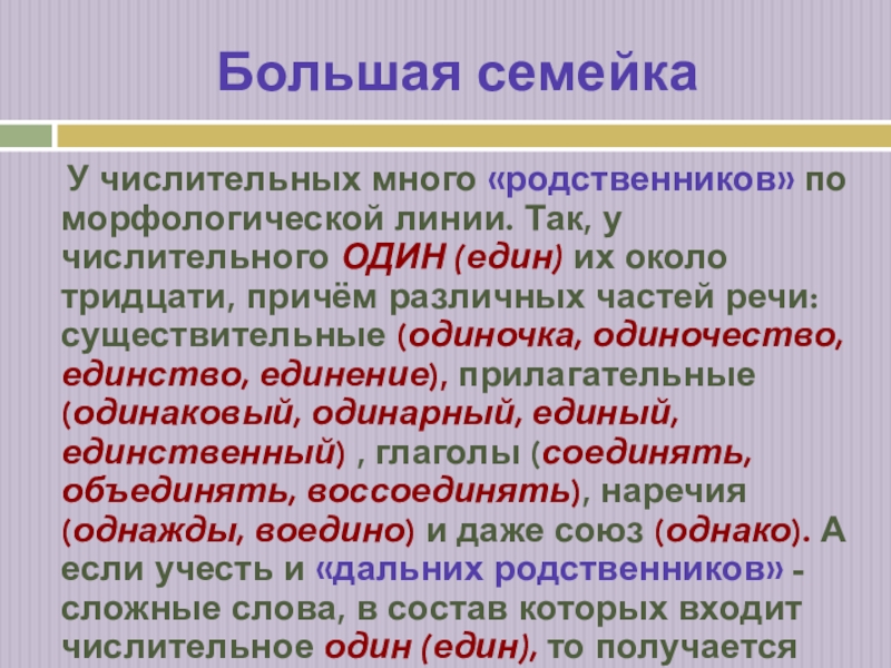 у числительного ОДИН (един) их около тридцати, причём различных частей речи: существительные (одиночка, одиночество, единство, единение), прилагательные (одинаковый, одинарный, единый, единственный) , глаголы (соединять, объединять, воссоединять), наречия (однажды, воедино) и даже союз (однако). А если учесть и «дальних родственников» - сложные слова, в состав которых входит числительное один (един), то получается внушительное семейство.