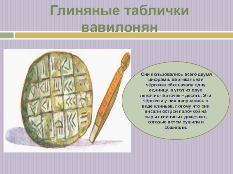 единицу, а угол из двух лежачих чёрточек – десять. Эти чёрточки у них получались в виде клиньев, потому что они писали острой палочкой на сырых глиняных дощечках, которые потом сушили и обжигали.