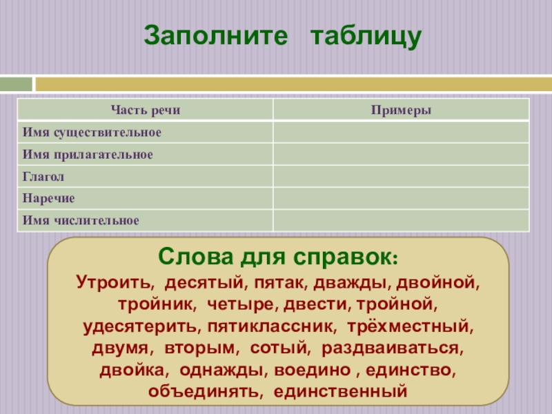 двести, тройной, удесятерить, пятиклассник, трёхместный, двумя, вторым, сотый, раздваиваться, двойка, однажды, воедино , единство, объединять, единственный