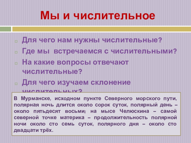 В Мурманске, исходном пункте Северного морского пути, полярная ночь длится около сорок суток, полярный день – около пятьдесят восьми; на мысе Челюскина – самой северной точке материка – продолжительность полярной ночи около сто семь суток, полярного дня – около сто двадцати трёх.