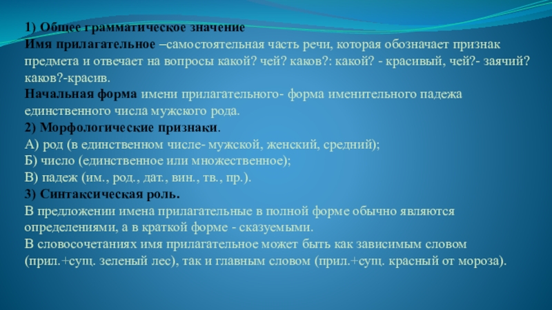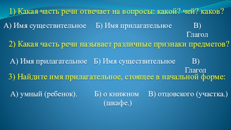 1) Какая часть речи отвечает на вопросы: какой? чей? каков?