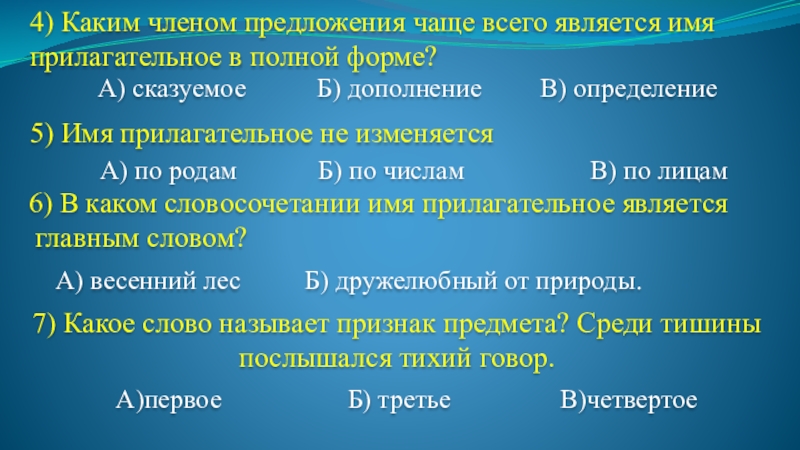 7) Какое слово называет признак предмета? Среди тишины послышался тихий говор.