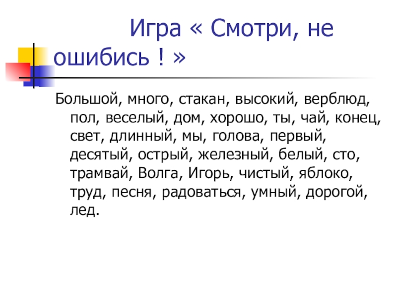 Большой, много, стакан, высокий, верблюд, пол, веселый, дом, хорошо, ты, чай, конец, свет, длинный, мы, голова, первый, десятый, острый, железный, белый, сто, трамвай, Волга, Игорь, чистый, яблоко, труд, песня, радоваться, умный, дорогой, лед.