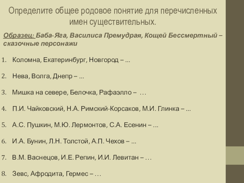 Определите общее родовое понятие для перечисленных имен существительных.