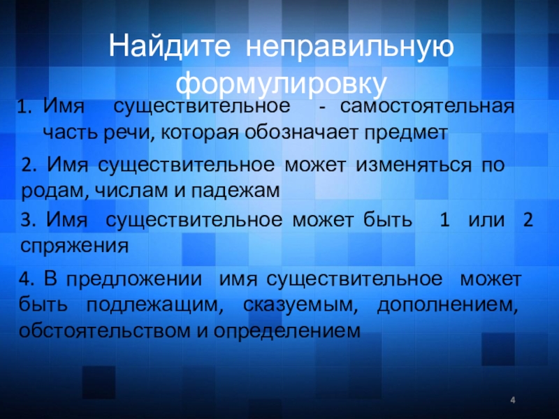 4. В предложении имя существительное может быть подлежащим, сказуемым, дополнением, обстоятельством и определением
