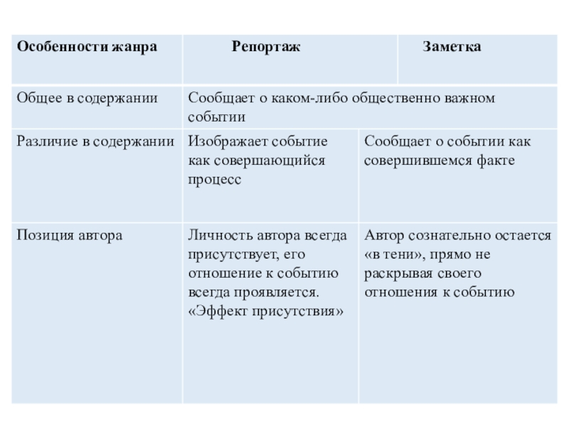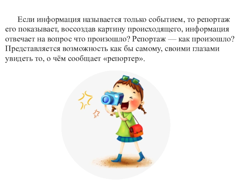 происходящего, информация отвечает на вопрос что произошло? Репортаж — как произошло? Представляется возможность как бы самому, своими глазами увидеть то, о чём сообщает «репортер».