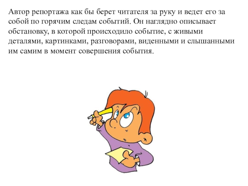 Слайд 18Автор репортажа как бы берет читателя за руку и ведет его