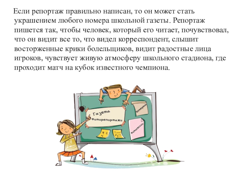 любого номера школьной газеты. Репортаж пишется так, чтобы человек, который его читает, почувствовал, что он видит все то, что видел корреспондент, слышит восторженные крики болельщиков, видит радостные лица игроков, чувствует живую атмосферу школьного стадиона, где проходит матч на кубок известного чемпиона.