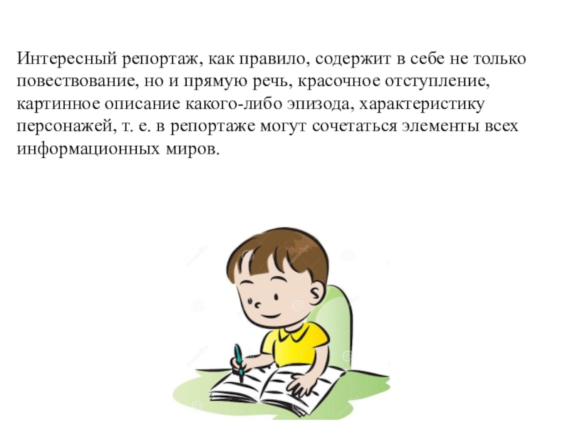 Слайд 16Интересный репортаж, как правило, содержит в себе не только повествование, но