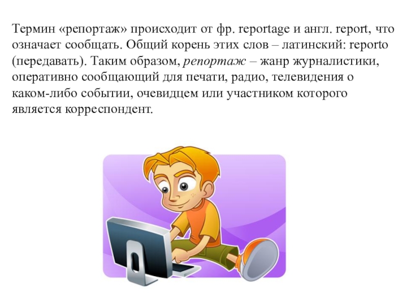Слайд 14Термин «репортаж» происходит от фр. reportage и англ. report, что означает