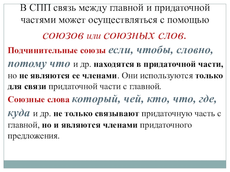 Подчинительные союзы если, чтобы, словно, потому что и др. находятся в придаточной части, но не являются ее членами. Они используются только для связи придаточной части с главной.