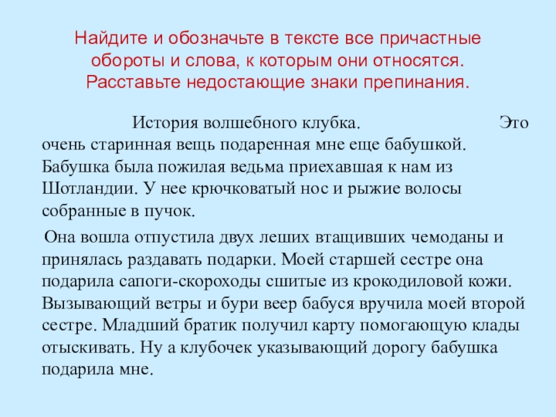 Она вошла отпустила двух леших втащивших чемоданы и принялась раздавать подарки. Моей старшей сестре она подарила сапоги-скороходы сшитые из крокодиловой кожи. Вызывающий ветры и бури веер бабуся вручила моей второй сестре. Младший братик получил карту помогающую клады отыскивать. Ну а клубочек указывающий дорогу бабушка подарила мне.