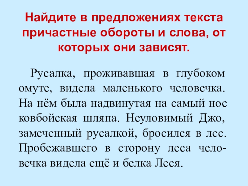 Русалка, проживавшая в глубоком омуте, видела маленького человечка. На нём была надвинутая на самый нос ковбойская шляпа. Неуловимый Джо, замеченный русалкой, бросился в лес. Пробежавшего в сторону леса чело-вечка видела ещё и белка Леся.