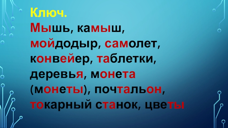 Ключ.Мышь, камыш, мойдодыр, самолет, конвейер, таблетки, деревья, монета (монеты), почтальон, токарный станок, цветы