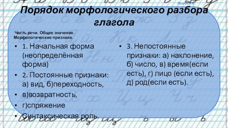 3. Непостоянные признаки: а) наклонение, б) число, в) время(если есть), г) лицо (если есть), д) род(если есть).
