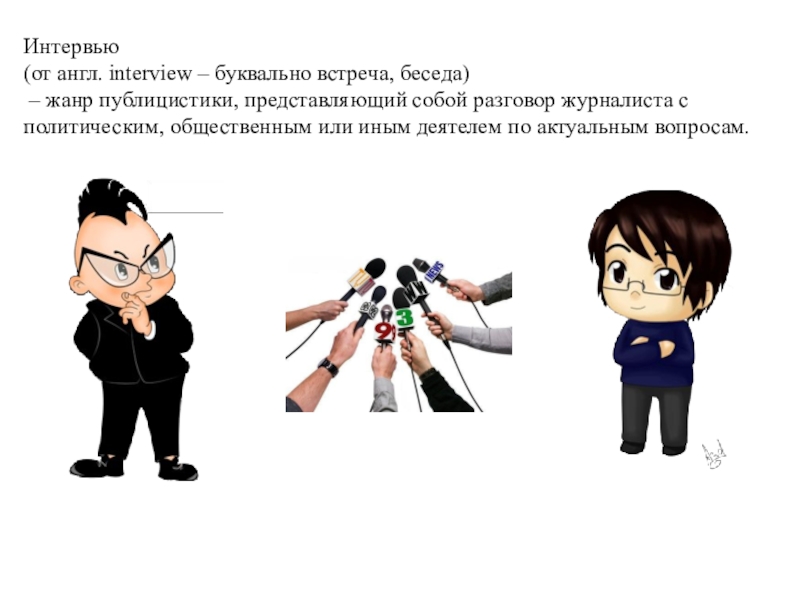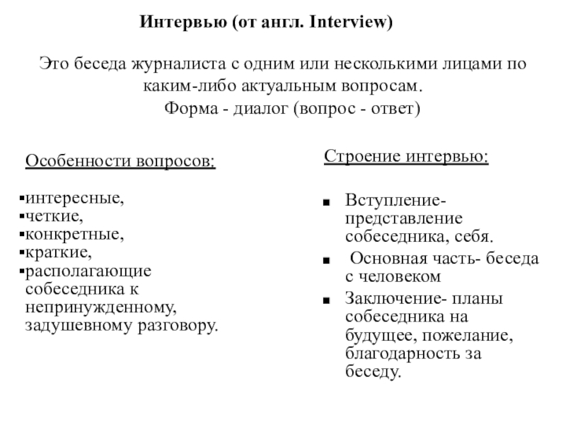 Это беседа журналиста с одним или несколькими лицами по каким-либо актуальным вопросам.