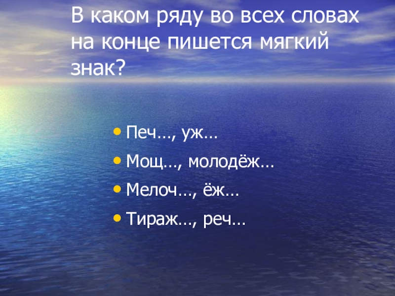 Слайд 3В каком ряду во всех словах на конце пишется мягкий знак?