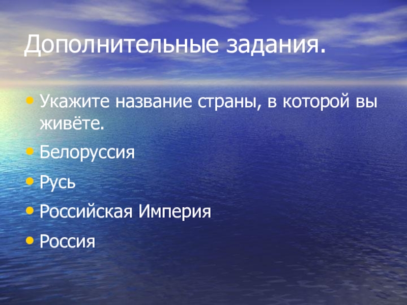 Дополнительные задания.Укажите название страны, в которой вы живёте.БелоруссияРусьРоссийская ИмперияРоссия