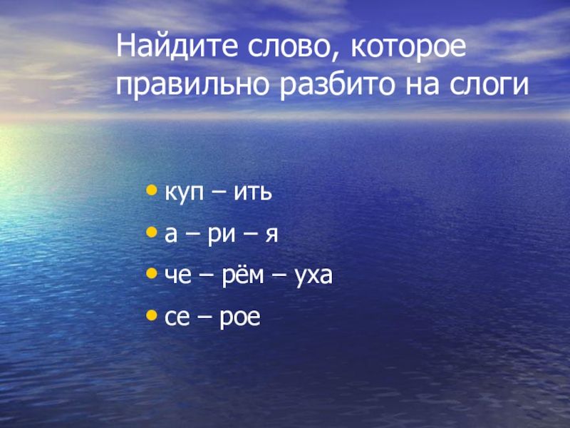 Слайд 4Найдите слово, которое правильно разбито на слоги